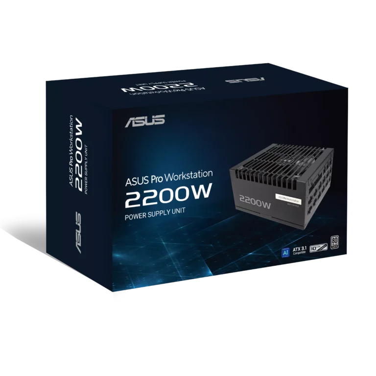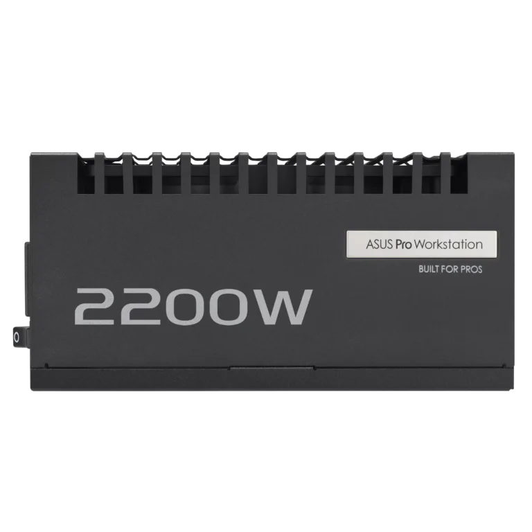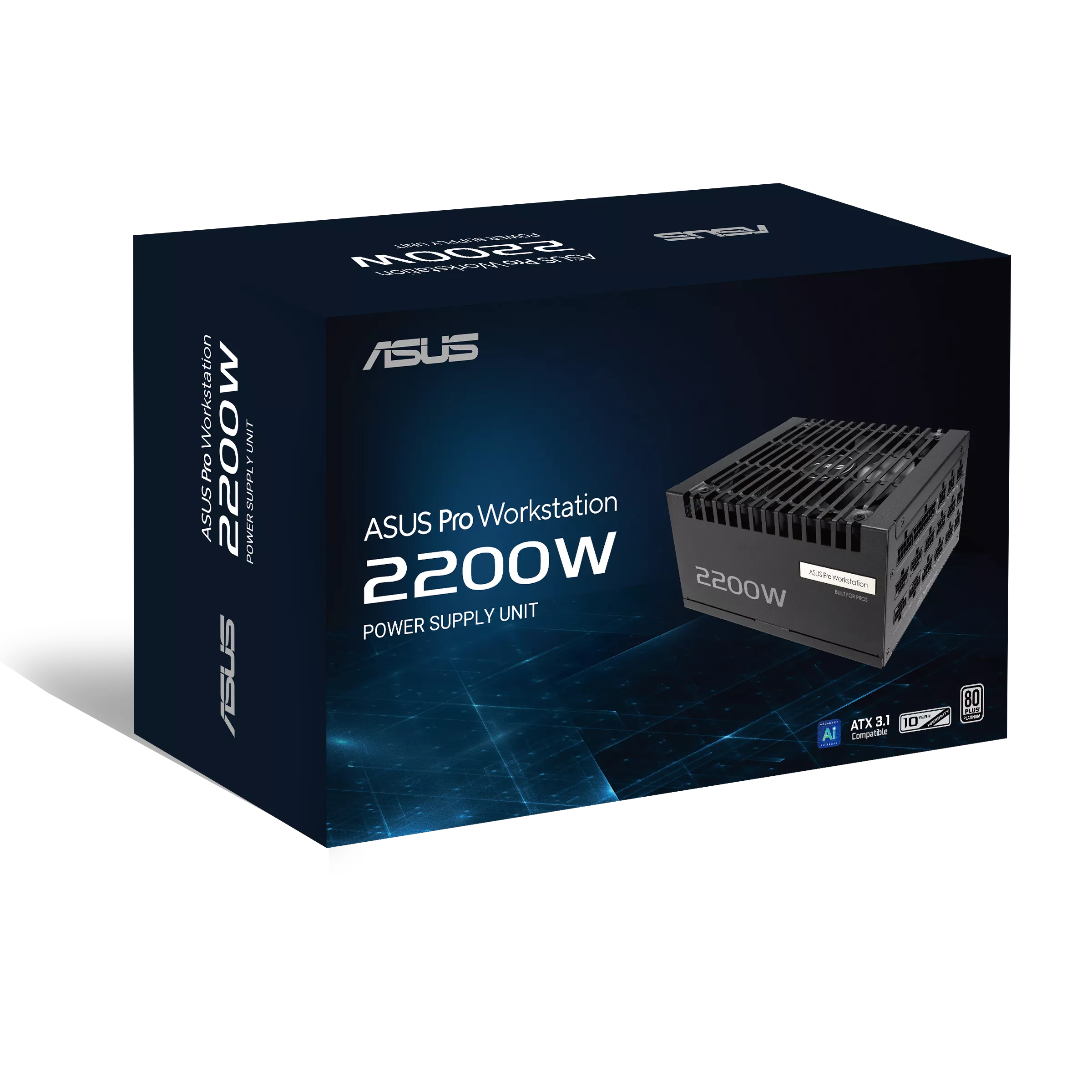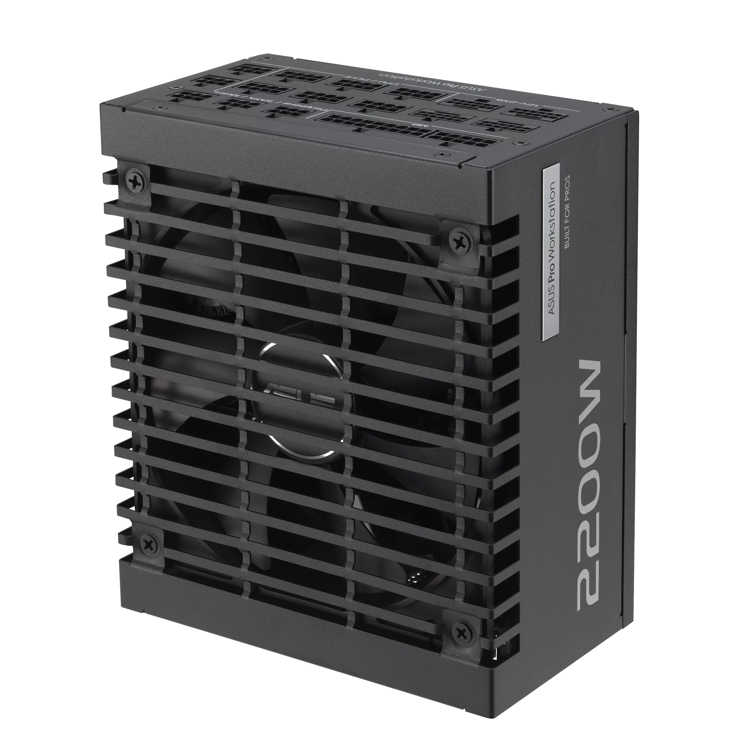 ASUS Pro WS 2200W Platinum PSU delivers exceptional voltage stability and advanced power delivery for professionals, supporting up to four graphics cards to meet the demanding AI workloads.