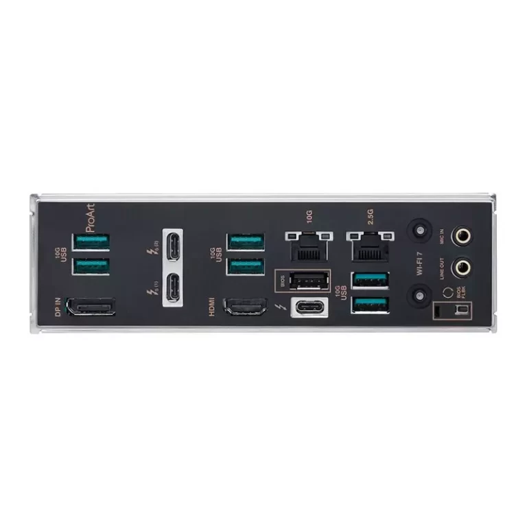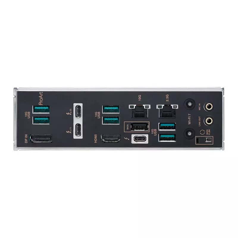 1 x BIOS Flashback Button 1 x DisplayPort 1 x HDMI 1 x Line Out 1 x Mic-In 2 x RJ-45 2 x Thunderbolt 5 (Type-C) with PD & DP 1.4 1 x USB 2.0 6 x USB 3.2 Gen2 Type-A 1 x USB 4.0 Type-C / Thunderbolt / DP |
