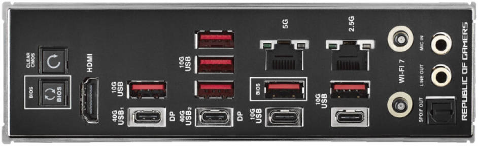 | Back Panel I/O Ports | 2 x USB4® (40Gbps) ports 8 x USB 10Gbps ports 1 x HDMI™ port 1 x Intel® 2.5Gb Ethernet port 1 x Realtek 5Gb Ethernet port 2 x Gold-plated audio jacks 1 x Optical S/PDIF out port |