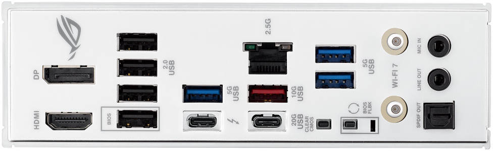 Equipped with PCIe® 5.0 support for the latest GPUs and M.2 drives, along with four M.2 slots and four SATA ports, the ROG STRIX B860-G ensures blazing-fast data transfer and seamless storage expansion. The inclusion of Thunderbolt™ 4, dual USB-C® ports (including one 20Gbps), and Wi-Fi 7 with Bluetooth® 5.4 provides unmatched connectivity and ultra-low latency for modern high-performance setups.