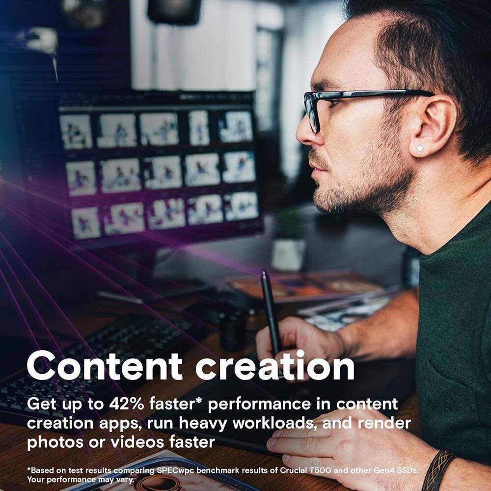 With sequential speeds up to 7300MB/s read and 6800MB/s write, the Crucial T500 accelerates game loading, shortens render times, and speeds up data-intensive tasks. It brings next-level responsiveness to demanding applications.
