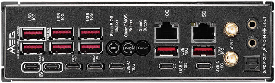 Front: 4x USB 2.0, 4x USB 5Gbps Type-A, 1x USB 10Gbps Type-C, 1x USB 20Gbps Type-C Rear: 8x USB 10Gbps Type-A, 5x USB 10Gbps Type-C, 2x USB 40Gbps Type-C |