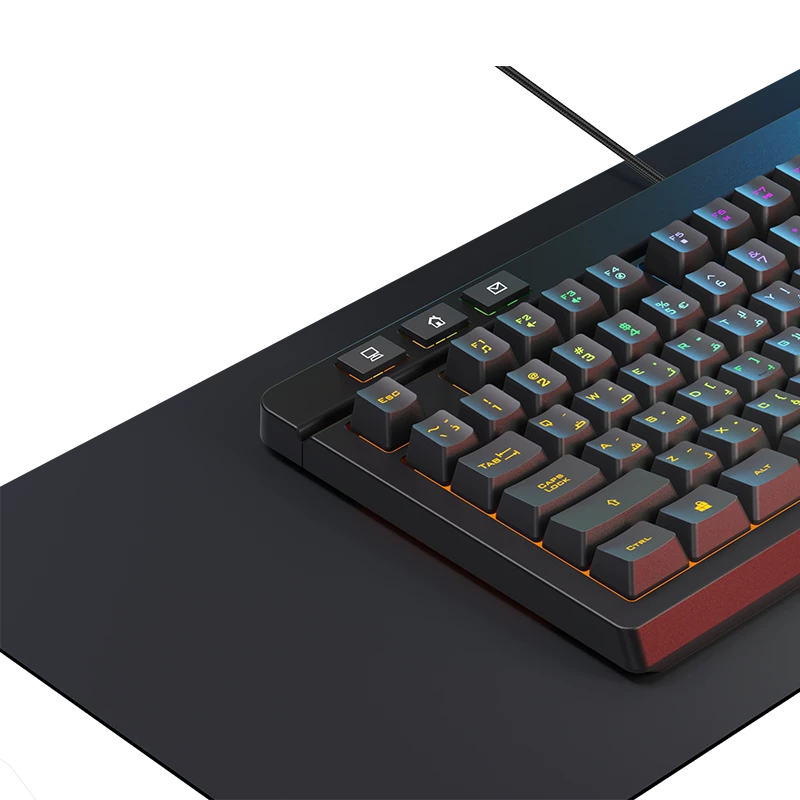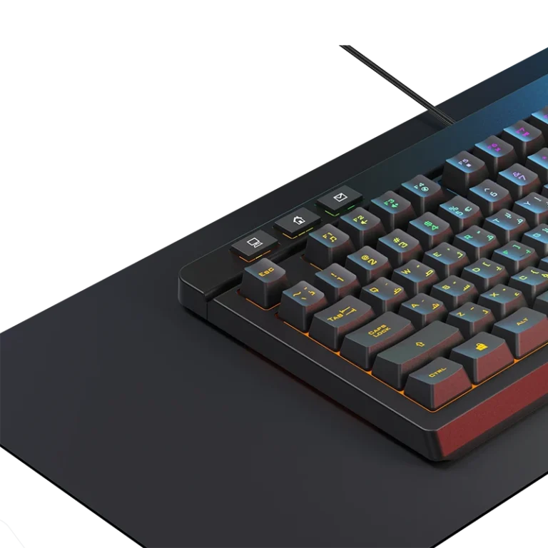 The keyboard features a smooth membrane design with responsive keys and RGB lighting, adding dynamic colors to your workspace or gaming zone. It supports Arabic language input, includes multimedia control via FN keys, and is built to last with a key lifespan of up to 10 million presses — perfect for both daily use and intense gaming sessions.