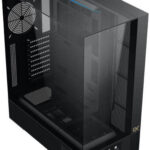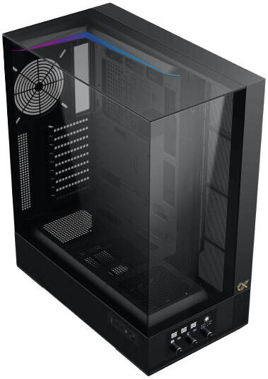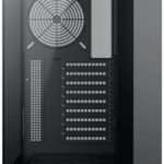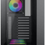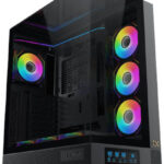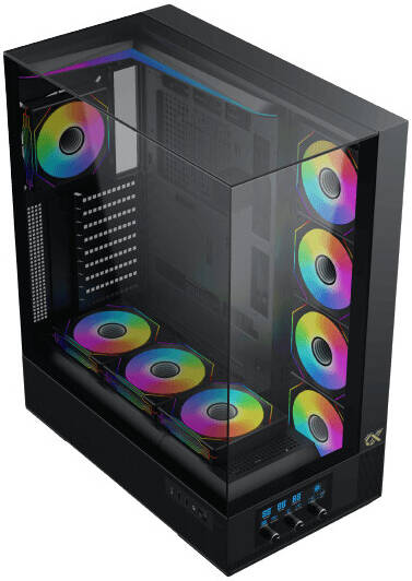 Three tempered glass panels (front, left, and right) offer a panoramic view of internal components and a striking showcase aesthetic